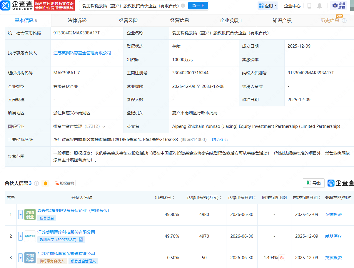 近日,爱朋智链云脑(嘉兴)股权投资合伙企业(有限合伙)成立,出资额1亿元,经营范围包含:股权投资;以私募基金从事创业投资活动。企查查股权穿透显示,该合伙企业由嘉兴思麟创业投资合伙企业(有限合伙)、爱朋医疗(300753)、江苏英掘私募基金管理有限公司共同持股。