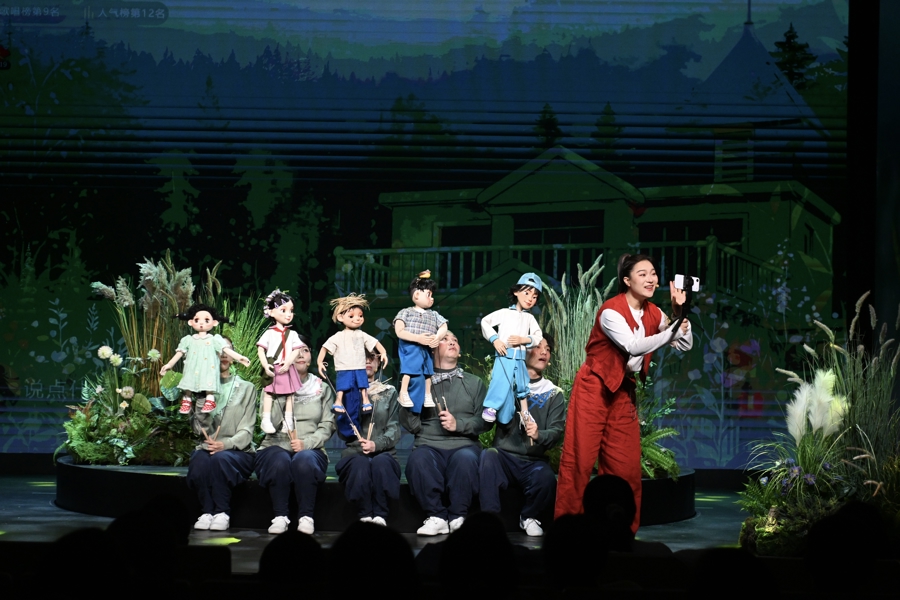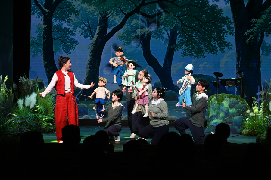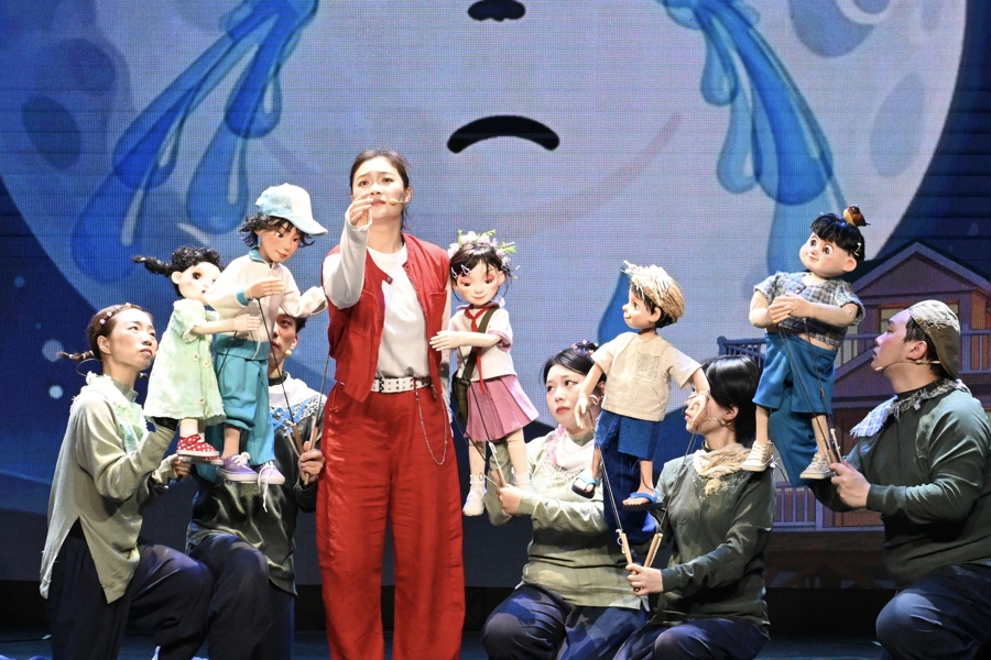 舞台以“人偶同构、虚实共生”的沉浸式设计,将青山绿水、乡村音乐课堂、网络直播间等多重空间诗意串联。灵动木偶与真人演员默契配合,电子音乐与现代舞美交融碰撞,生动呈现一群青少年以歌逐梦、在艺术滋养中找回初心的动人故事。