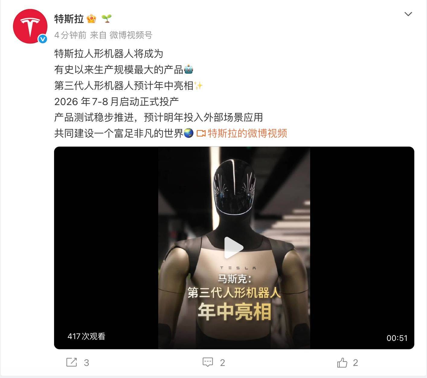 凤凰网科技讯 4月23日,据特斯拉官方微博,特斯拉第三代人形机器人预计年中亮相,2026年7-8月启动正式投产,产品测试稳步推进,预计明年投入外部场景应用。